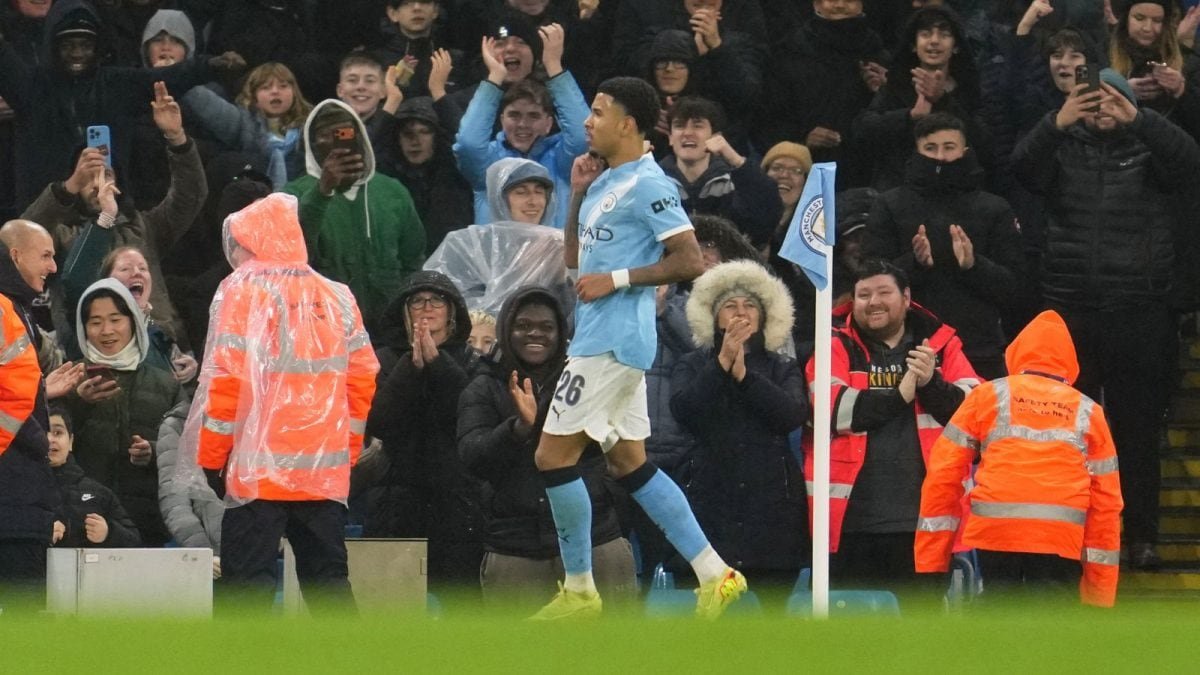 बुधवार, १७ डिसेंबर २०२५ रोजी इंग्लंडमधील मँचेस्टर सिटी आणि ब्रेंटफोर्ड यांच्यातील मँचेस्टर सिटी आणि ब्रेंटफोर्ड यांच्यातील EFL कप सामन्यात त्याच्या संघाचा दुसरा गोल केल्यावर मँचेस्टर सिटीचा खेळाडू सविन्हो आनंद साजरा करत आहे. (एपी फोटो/जॉन सोपर)