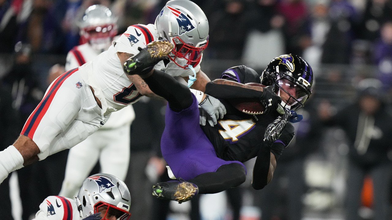 न्यू इंग्लंडच्या क्वार्टरबॅक ड्रेक मेने दोन फंबल्स, सात पेनल्टी आणि 380-यार्ड पासिंगच्या कामगिरीने बाल्टिमोरला घरच्या मैदानावर 3-6 विक्रमासह सोडले.