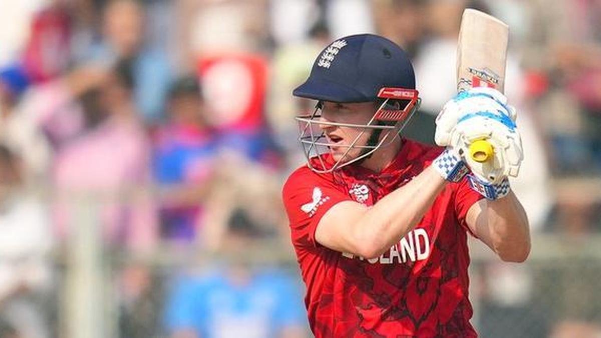 इंग्लंड आणि नेपाळ यांच्यातील T20 विश्वचषक क्रिकेट सामन्यादरम्यान इंग्लंडचा कर्णधार हॅरी ब्रुक शॉट खेळत आहे. | फोटो क्रेडिट: एपी