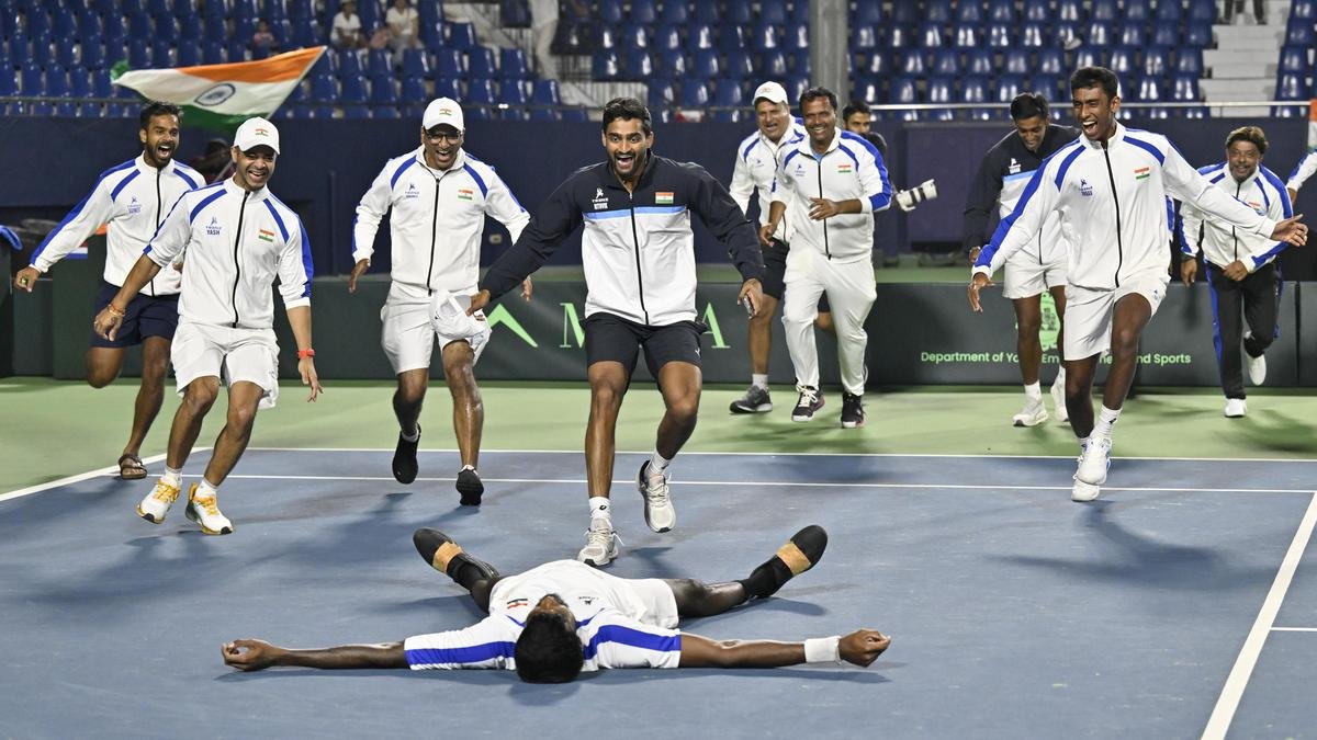 नेदरलँड्सविरुद्ध डेव्हिस चषक सामना जिंकल्यानंतर टीम इंडियाने जल्लोष केला. | फोटो क्रेडिट: के. मुरली कुमार