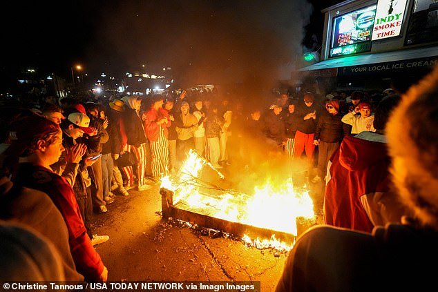कडाक्याच्या थंडीच्या तापमानामुळे न घाबरता, काही चाहत्यांनी हुसियर्सच्या विजयाचा आनंद साजरा करण्यासाठी अजूनही त्यांचे शर्ट काढले — कदाचित नंतर त्यांच्या सहकारी विद्यार्थ्यांनी तयार केलेल्या बोनफायरमुळे ते गरम झाले.