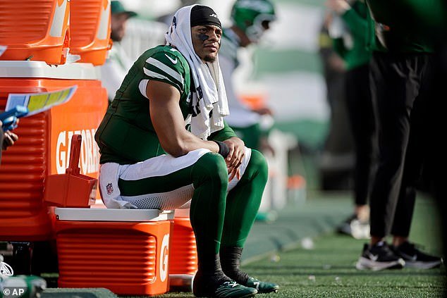 बॅकअप जेट्सचा क्वार्टरबॅक टायरॉड टेलर (2) रविवारच्या पराभवानंतर मैदानातून बाहेर पडला.
