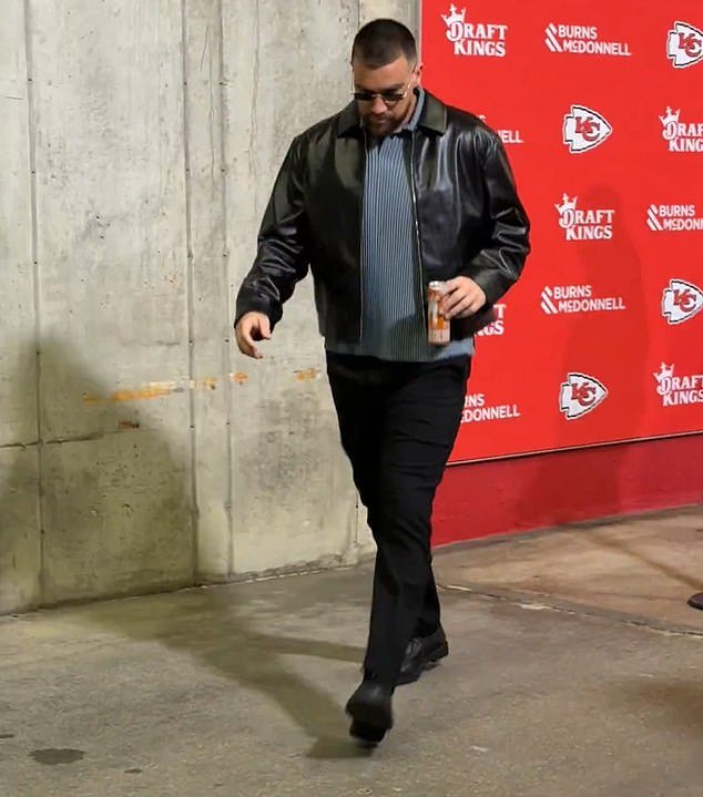 ट्रॅव्हिस केल्स रविवारी लास वेगास रायडर्स विरुद्ध कॅन्सस सिटी चीफ्सच्या शोडाउनसाठी एरोहेड स्टेडियमवर पोहोचल्याचे चित्र आहे.