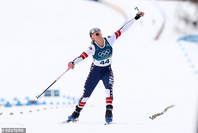 अमेरिकन हिवाळी ऑलिम्पिक स्टार जेसी डिगिन्स मिलान-कोर्टिना येथे महिलांच्या क्रॉस-कंट्री स्कीइंग 10 किमी शर्यतीत कांस्यपदक जिंकण्यासाठी अंतिम रेषेवर कोसळल्यानंतर दुःखाने ओरडली.