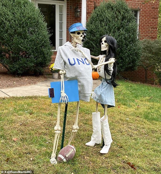 नॉर्थ कॅरोलिनाच्या चाहत्याचा बिल बेलीचिक आणि जॉर्डन हडसन हॅलोविन डिस्प्ले या जोडप्याच्या आनंदी चित्रणासाठी ऑनलाइन व्हायरल झाला आहे.