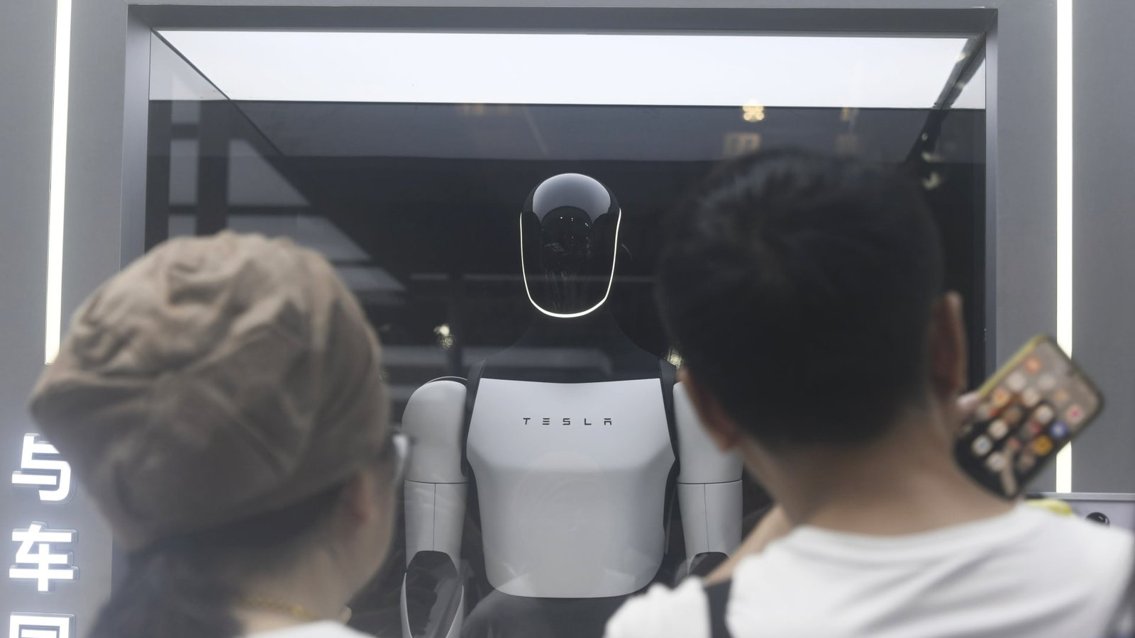 अभ्यागत सोमवार, 28 जुलै 2025 रोजी चीनमधील शांघाय येथील जागतिक कृत्रिम बुद्धिमत्ता परिषदेत टेस्लाने प्रदर्शित केलेल्या ऑप्टिमस ह्युमनॉइडचे परीक्षण करतात.