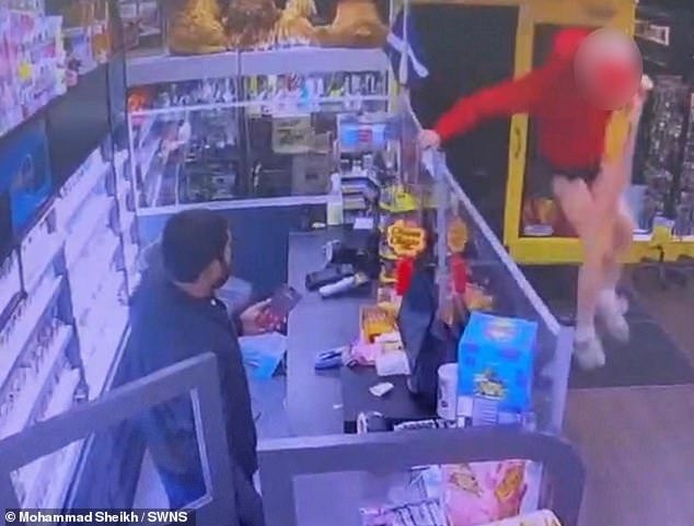 धाडसी दुकानदार त्याच्या दुकानाचे रक्षण करत असताना, बॅट असलेल्या व्यक्तीने काउंटरवर उडी मारली, पर्स्पेक्स स्क्रीन फाडली आणि प्रक्रियेत उभा राहिला.