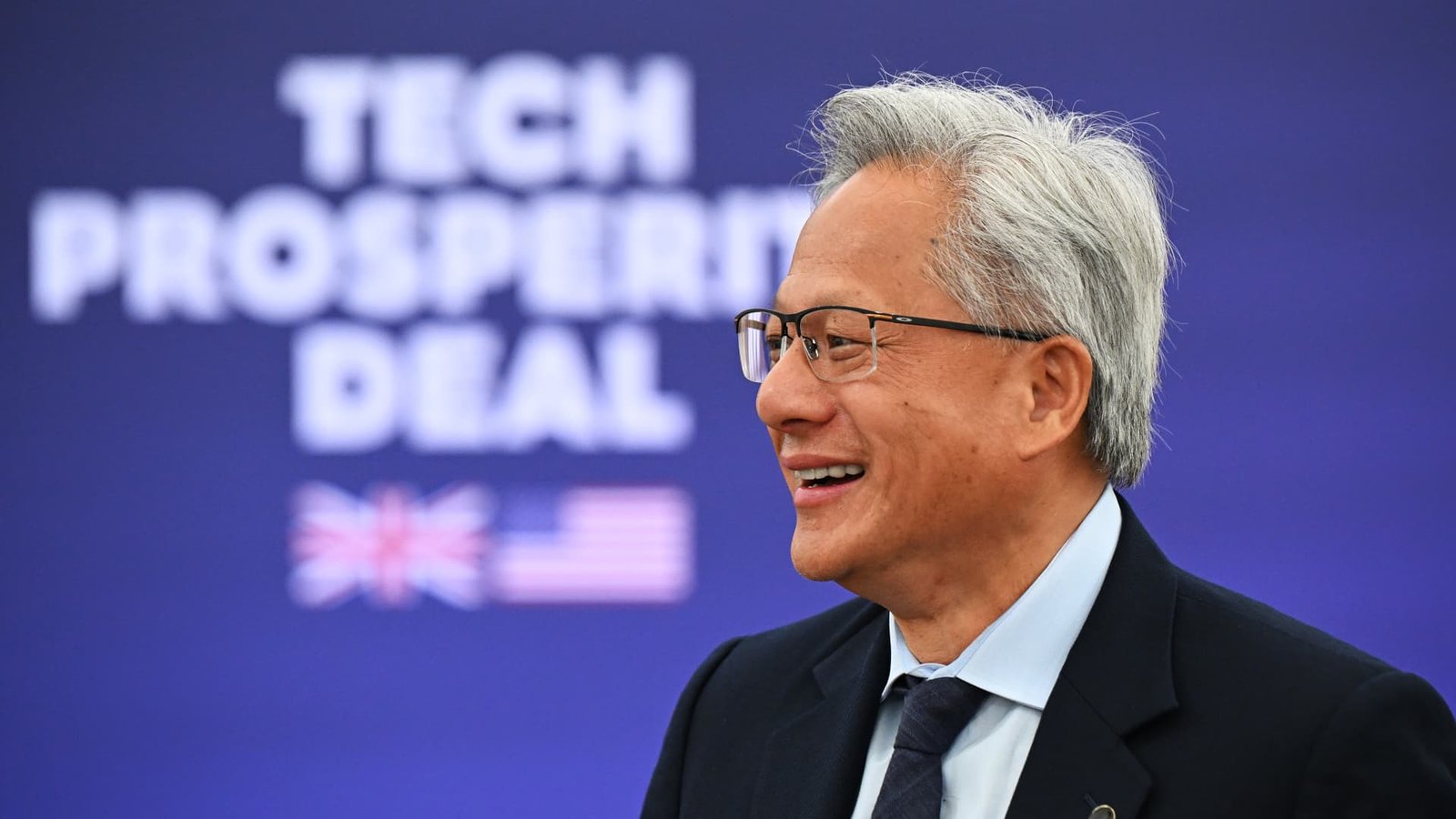 अमेरिकेचे अध्यक्ष डोनाल्ड ट्रम्प आणि यूके पंतप्रधान केअर स्टार्मर यांच्या राज्य दौर्याच्या शेवटी एनव्हीडियाचे मुख्य कार्यकारी अधिकारी जेन्सेन हुआंग यांनी इंग्लंडच्या ईसबेरी येथे 7 सप्टेंबर 2012 रोजी पत्रकार परिषदेत भाग घेतला.