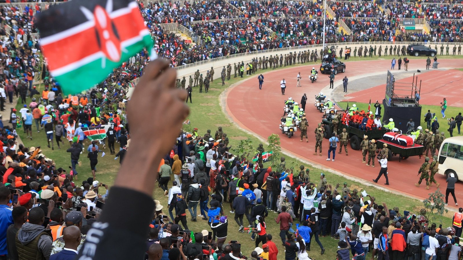 शनिवारी सॉकर स्टेडियमवर लष्करी अधिकारी, नियमित पोलीस आणि हवाई पाळत ठेवणारी पथके उपस्थित होती जिथे हजारो शोक करणारे ओडिंगाचा मृतदेह पाहण्याच्या संधीची वाट पाहत रात्रभर थांबले.