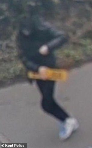 केंट पोलिसांनी जारी केलेल्या चित्रांमध्ये गडद कपडे घातलेले दोन हूड केलेले पुरुष पायी भागातून पळून जात आहेत तर त्यांच्यापैकी एकाकडे पिवळी नंबर प्लेट आहे.