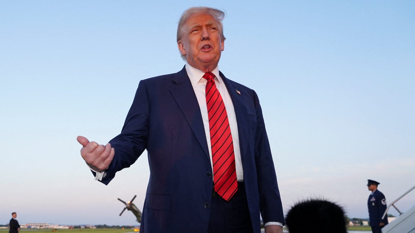 अमेरिकेचे अध्यक्ष डोनाल्ड ट्रम्प पेनसिल्व्हेनिया यांनी 3 ऑगस्ट 2025 रोजी अमेरिकेतील लेही व्हॅली आंतरराष्ट्रीय विमानतळावर प्रेस सदस्यांशी बोलले.