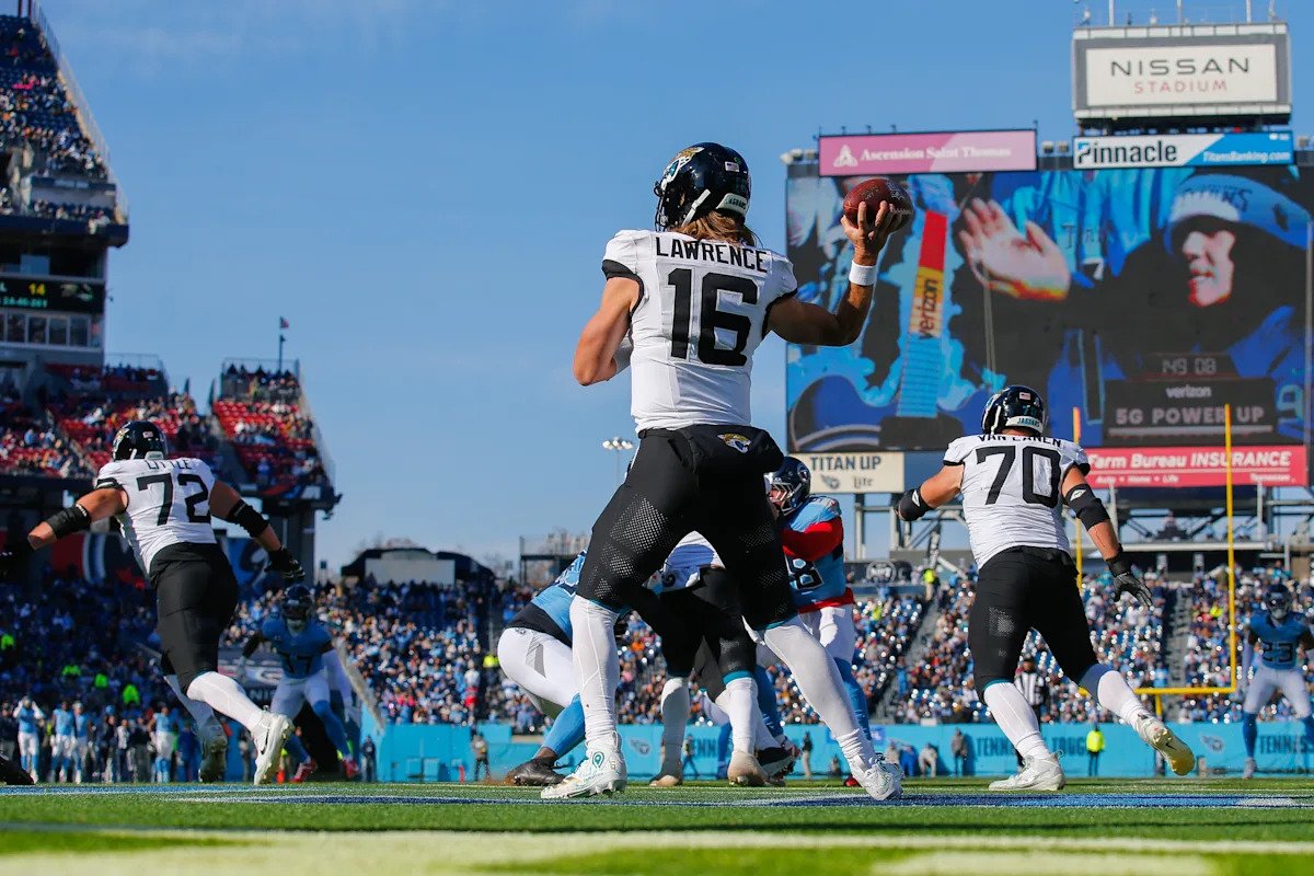टेनेसी टायटन्सला जॅक्सनव्हिल जग्वार्स क्वार्टरबॅक ट्रेव्हर लॉरेन्सला हाफटाइमच्या आधी पंट करण्याची संधी होती, परंतु ती किंमत मोजावी लागली. दुसऱ्या तिमाहीत लॉरेन्सची वेळ संपल्यानंतर खंडपीठे मोकळी झाली आणि कमीतकमी काही भांडणे झाली.