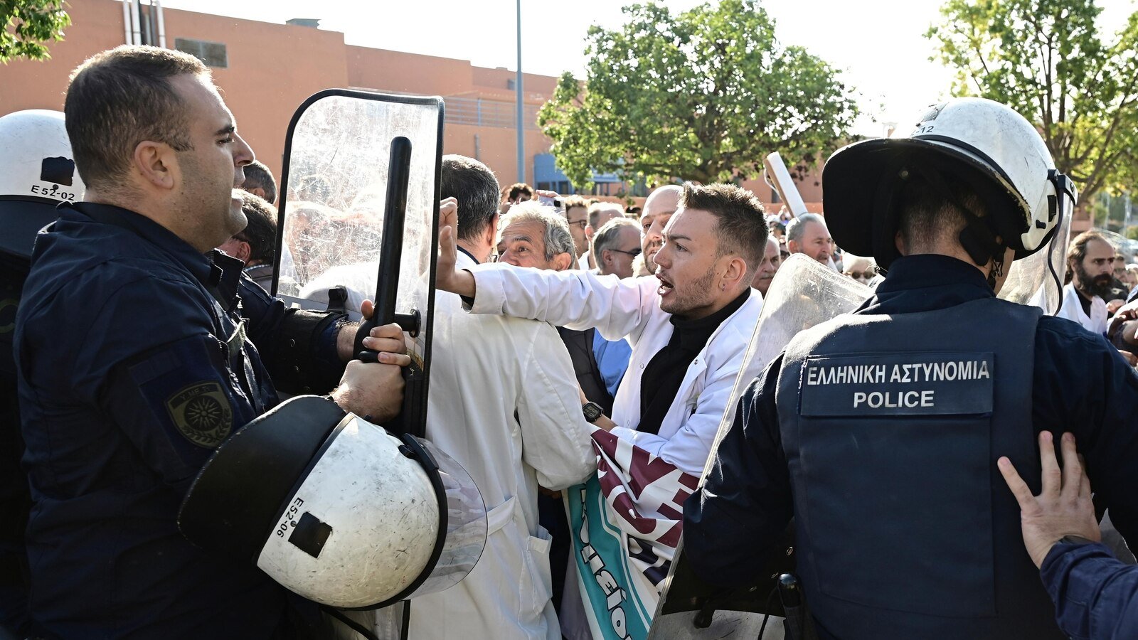 देशाच्या पंतप्रधानांनी रुग्णालयात भेट देताना सार्वजनिक आरोग्य सेवा राज्याच्या निषेधासाठी डझनभर कामगार जमले, दंगल पोलिसांनी अथेन्सच्या सार्वजनिक रुग्णालयात वैद्यकीय कर्मचार्‍यांशी लढा दिला.