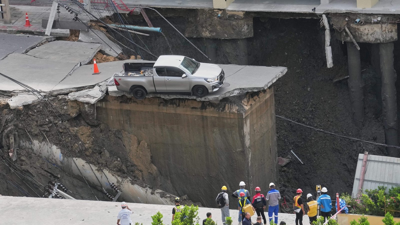 कोसळल्याच्या व्हिडिओमध्ये, रस्त्याचा चेहरा हळूहळू बुडतो आणि अनेक इलेक्ट्रिक पोल पाण्याच्या पाईप्सकडे ओढतात. जसजसे भोक मोठे होत गेले तसतसे कारने चार-लेन रोड पूर्णपणे मागे व पुढे जाण्याचा प्रयत्न केला. छिद्राच्या एका टोकाला त्याची भूमिगत रचना उघडकीस आली आणि पोलिस स्टेशनच्या समोर थांबली.