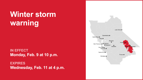 योसेमाइट, अप्पर सॅन जोक्विन नदी आणि कैसर ते रॉजर्स रिज हे सोमवारी सकाळी 12:19 वाजता राष्ट्रीय हवामान सेवेने जारी केलेल्या हिवाळी वादळाच्या चेतावणीचे केंद्रबिंदू आहेत. चेतावणी सकाळी 10 ते दुपारी 4 पर्यंत वैध आहे. बुधवारी, 11 फेब्रुवारी रोजी