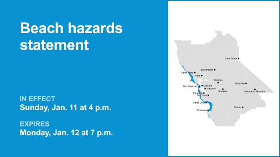 पॉइंट रेयेस नॅशनल सीशोर, सॅन फ्रान्सिस्को पेनिन्सुला कोस्ट, नॉर्दर्न मॉन्टेरी बे आणि सदर्न मॉन्टेरी बे आणि कोस्टल नॉर्थ बे, बिग सुर कोस्ट आणि सॅन फ्रान्सिस्को काउंटीसह, रविवारी सकाळी 12:01 वाजता राष्ट्रीय हवामान सेवेने जारी केलेल्या समुद्रकिनाऱ्याच्या धोक्याच्या विधानाचे केंद्रबिंदू आहेत. विधान दुपारी 4 पासून वैध आहे. सोमवार, 12 जानेवारी, संध्याकाळी 7 वाजता