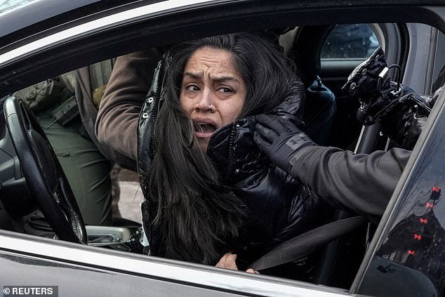 मिनियापोलिसमधील इमिग्रेशन आणि कस्टम्स एन्फोर्समेंट एजंट्सनी 42 वर्षीय आलिया रहमानला तिच्या फोर्ड फ्यूजनमधून खेचले कारण ती मंगळवारी ड्रायव्हरच्या बाजूच्या दरवाजाला चिकटून राहिली.