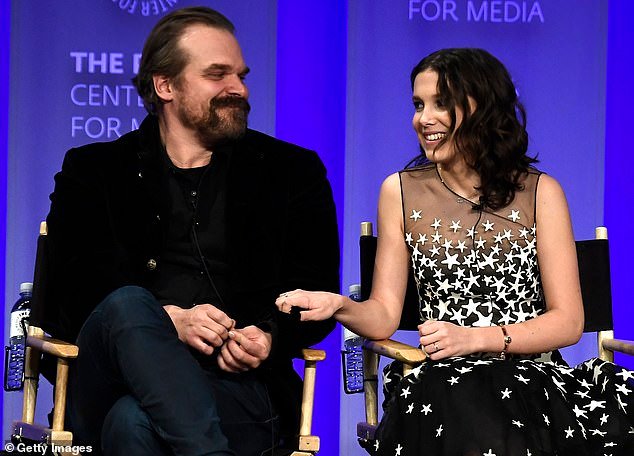 डेव्हिड हार्बर त्याच्या स्ट्रेंजर थिंग्ज सह-कलाकार मिली बॉबी ब्राउनसह