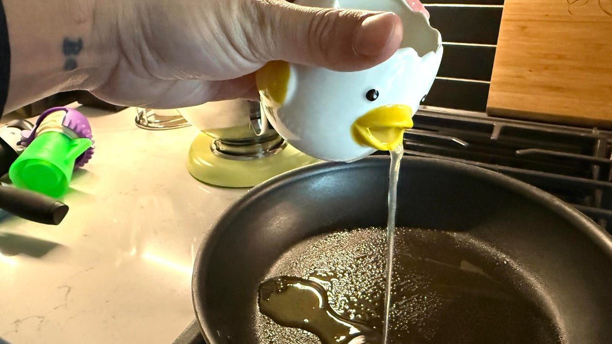 हे मनमोहक (परंतु त्याऐवजी ओंगळ, जर तुम्ही त्याबद्दल विचार केला तर) चिकन हेड-आकाराचे गॅझेट नक्कीच कार्य करते, परंतु मला खात्री नाही की त्याची किंमत $9 आहे जोपर्यंत किचनच्या नाजूक सजावटीच्या भागाप्रमाणे दुप्पट होत नाही. जहाज फक्त दोन मोठे धारण करू शकते अंडी त्याच्या चोचीच्या छिद्रातून पांढरे पडल्याशिवाय, स्पष्टपणे, कोणीही आता अंड्याचे पांढरे एक पुठ्ठा खरेदी करू शकतो.