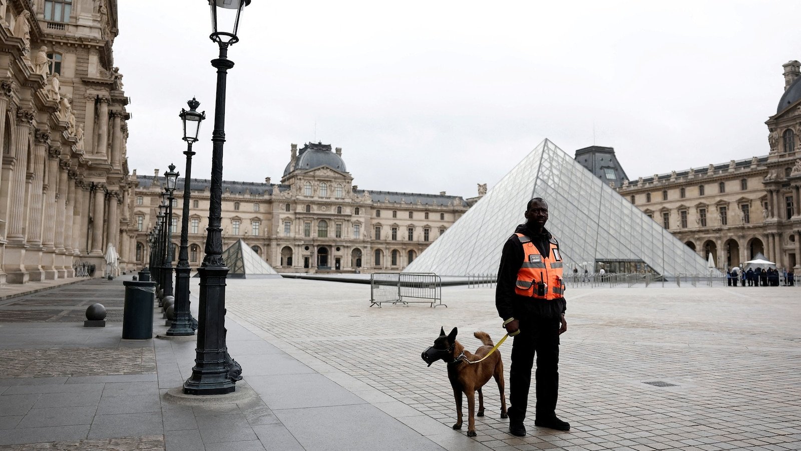 लुव्रे म्युझियमच्या काचेच्या पिरॅमिडजवळ एक सुरक्षा रक्षक कुत्रा घेऊन उभा आहे कारण चोरांनी एका नेत्रदीपक दागिन्यांच्या चोरीच्या दुसऱ्या दिवशी संग्रहालय बंद ठेवले होते ज्यांनी क्रेनचा वापर करून खूणमध्ये प्रवेश केला आणि वरच्या मजल्यावरील खिडकी फोडली, अशा भागातून मौल्यवान दागिने चोरले जेथे फ्रेंच क्राउन, क्राउन ऑफ फ्रान्स डील, फ्रान्स डील, क्राउन डील. 20, 2025.