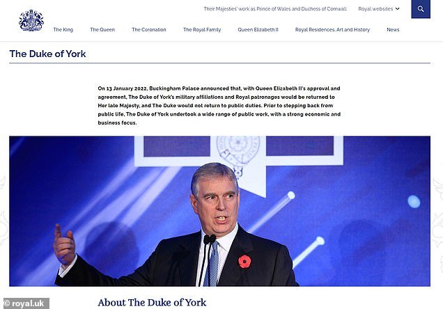 ड्यूक ऑफ यॉर्कचे शीर्षक गमावण्यासाठी रॉयल फॅमिली वेबसाइट अद्यतनित केली गेली आहे. बदल पाहण्यासाठी डावीकडून उजवीकडे स्वाइप करा