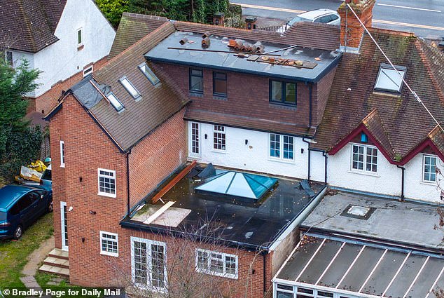 बर्कशायर येथील श्री हुसेन यांच्या घराच्या मागील बाजूचे दृश्य. छताच्या काही भागावर पॅचवर्क करून काम अपूर्ण राहिले आहे