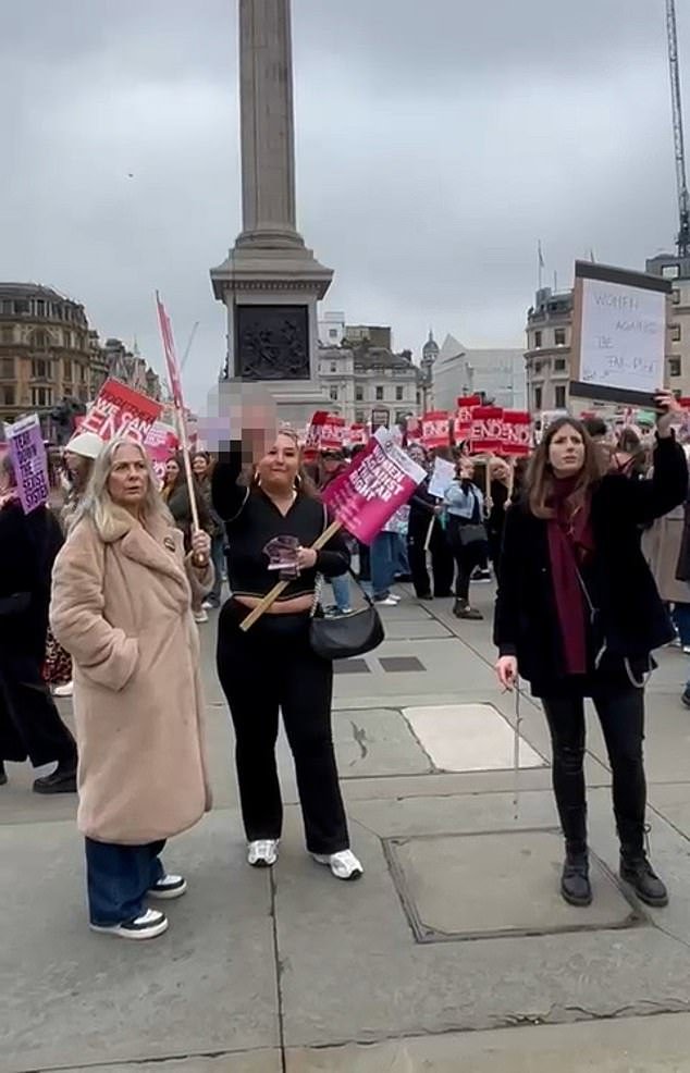 शनिवारच्या निषेधाच्या फुटेजमध्ये ट्रॅफलगर स्क्वेअर (चित्रात) मध्ये एक महिला इराणी सरकारविरोधी आंदोलकांवर “फक यू” ओरडताना आणि “महिलांच्या विरुद्ध उजव्या” असे लिहिलेले चिन्ह धरून तिचे मधले बोट फ्लॅश करताना दिसते.
