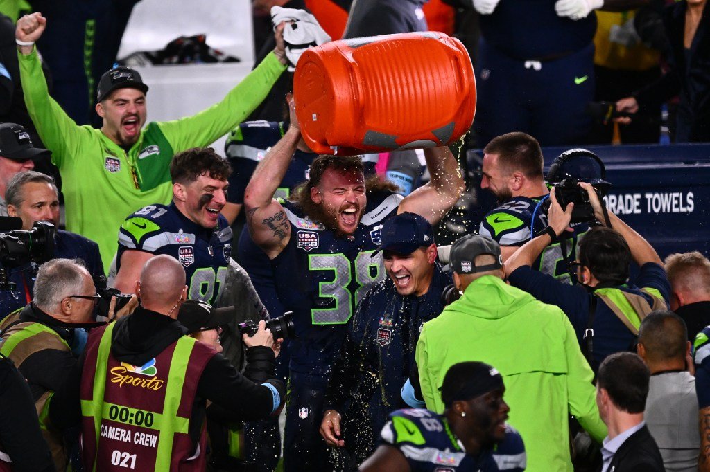 सांता क्लारा – सॅम डार्नॉल्ड त्याच्या डाव्या हातात एक हलकी बिअर पकडत असताना त्याचा नवीन टी-शर्ट आणि सिएटल सीहॉक्स लोगो असलेली टोपी “सुपर बाउल LX चॅम्पियन्स” अशी ओरडत आहे.
