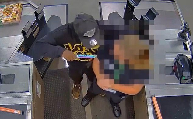 सुपरमार्केट जायंटने जाहीर केलेल्या फुटेजमध्ये एक मुखवटा घातलेला माणूस तिच्या मागूनून त्याच्याकडे आला आणि तिला खांद्यावर टॅप केले तेव्हा ग्राहकांना सेवा देणा customers ्या चेकआऊटमध्ये त्या महिलेला दर्शविले.