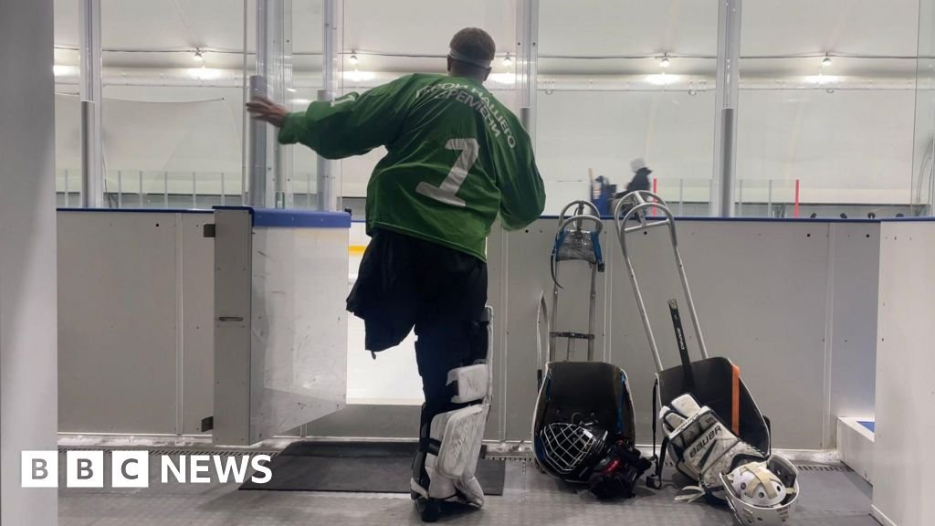 बीबीसी रशियन आईस हॉकी प्लेयरमध्ये, पॅड आणि ग्रीन जर्सी परिधान करून एका पायासह बर्फ रिंकमध्ये प्रवेश करते बीबीसी