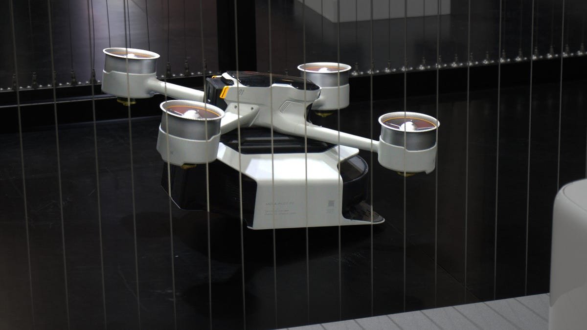 डेमोसाठी, हे सर्व एका लहान धातूच्या बॉक्समध्ये समाविष्ट आहे, कारण Mova आणि CES आयोजकांना पायलट 70 गर्दीच्या शोच्या मजल्यावर कुठेतरी क्रॅश होऊ इच्छित आहे. मी पुन्हा लँडिंग करण्यापूर्वी ड्रोनला 30 सेकंद ते एका मिनिटापर्यंत हवेत टेक ऑफ करताना आणि फिरताना पाहिले. मला ते वर चित्रित केलेल्या काळ्या प्लॅटफॉर्मवर उतरण्याची अपेक्षा होती, परंतु काही कारणास्तव, तसे झाले नाही. मोवा येथील माझ्या स्त्रोताने सांगितले की लँडिंगने मागील डेमोमध्ये काम केले होते, परंतु यावेळी तांत्रिक समस्या असू शकते.