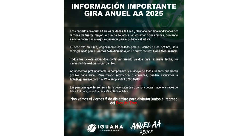 मैफिली अनुएल ए शहरांमध्ये लिमा सक्तीच्या कारणांमुळे सँटियागो सुधारित केले गेले आहे, ज्यामुळे या तारखांचे पुनर्निर्धारित केले गेले आहे, ज्यामुळे प्रेक्षकांना नेहमीच सर्वोत्तम अनुभव मिळेल.